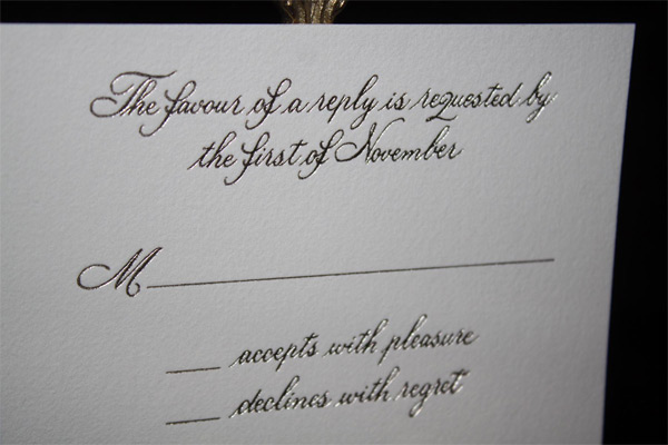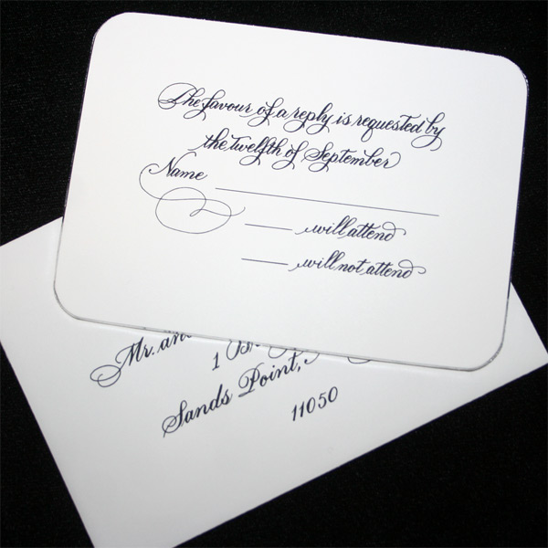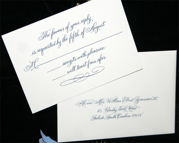 | Letter Press Wedding Invitation in Flourished Spencerian (click to enlarge) | and Return Response Envelope (click to enlarge) |