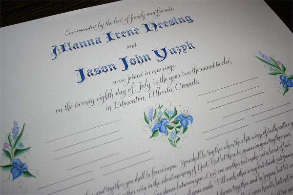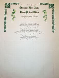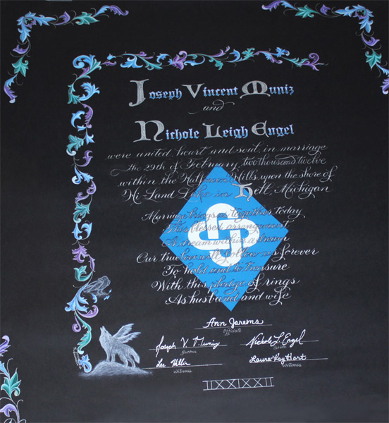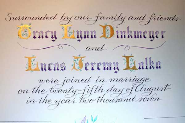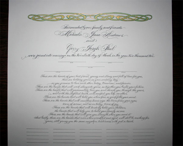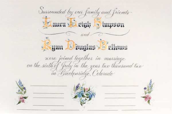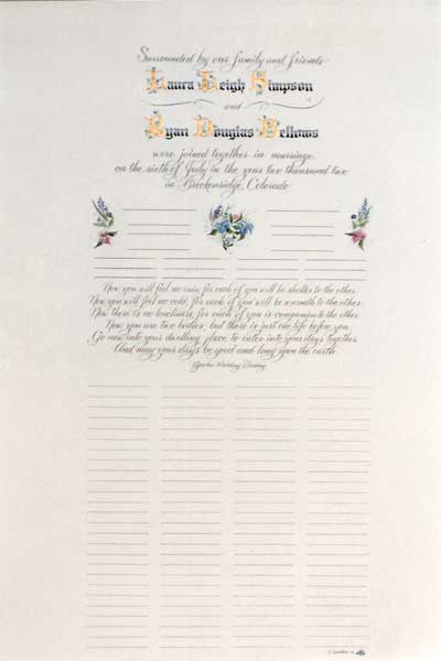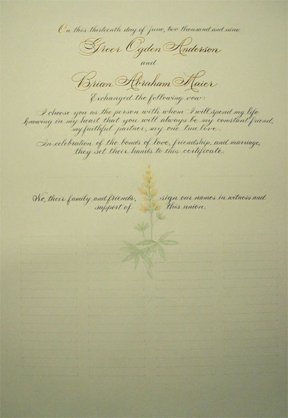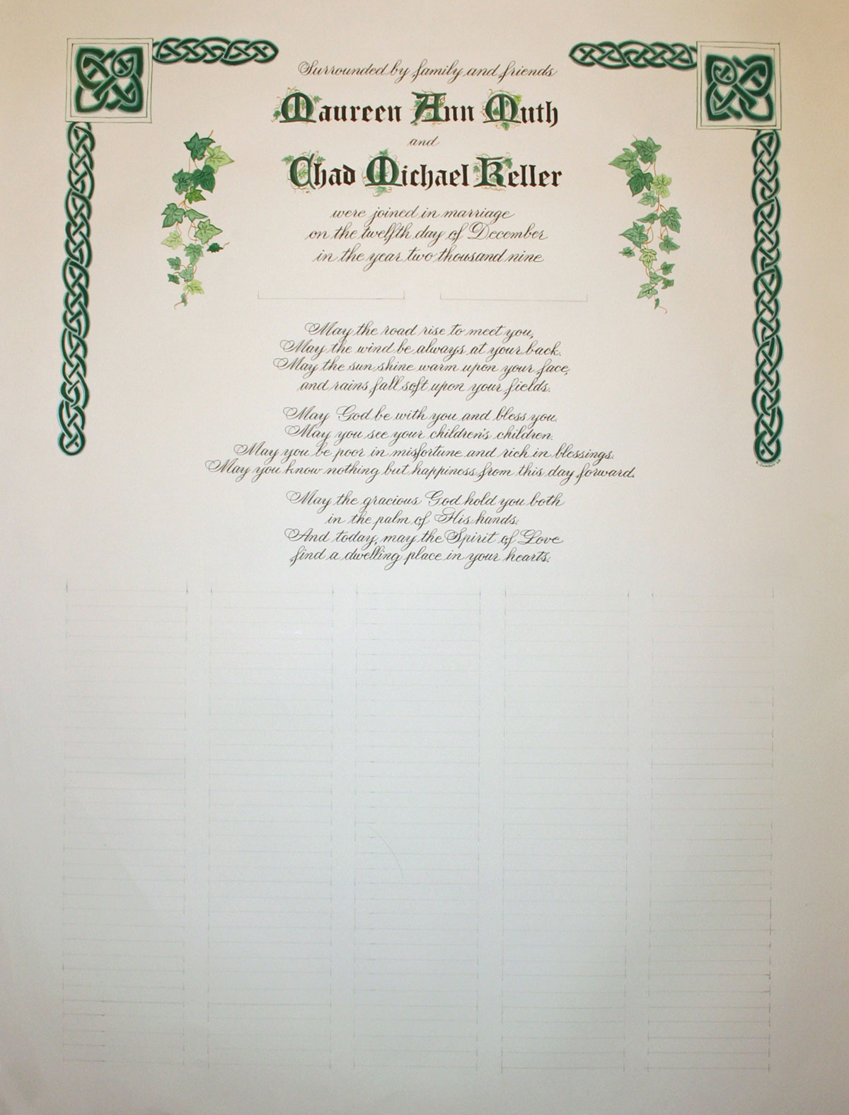Wedding Certificate with Colorado Lupine Flourished Spencerian Script names with Rook Script text (click to enlarge) | Celtic Knotwork Scroll guest lines in pencil for easy removal Citadel Script with Illuminated names (click to enlarge) | |