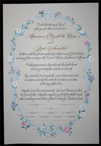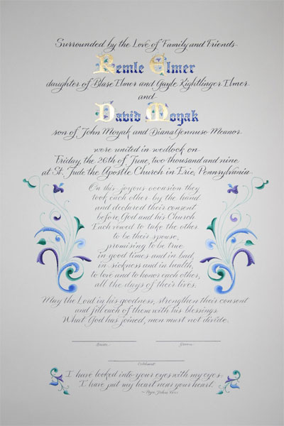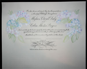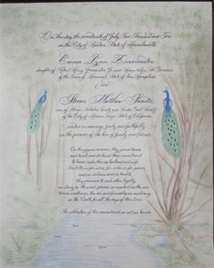![]() Wedding Certificate with Special Vows in Citadel script with Illuminated names (click to enlarge) | Acanthus Leaves Wedding Certificateon Black Paper with Silver Script (click to enlarge) |