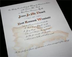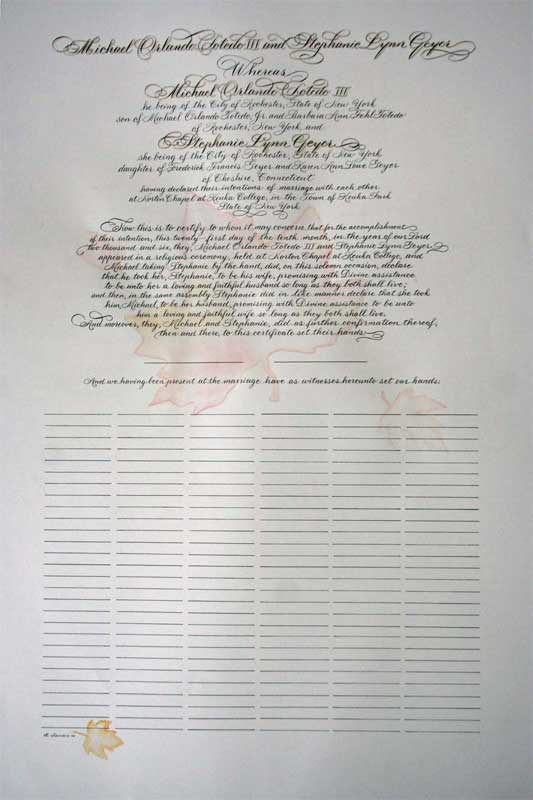 ![]() Personalized Wedding Certificate hand painted with a tree lined stream in Bickham Script (click to enlarge) | Certificate of Marriage in Bickham Script and Rook Script on natural colored goat skin parchment (click to enlarge) |