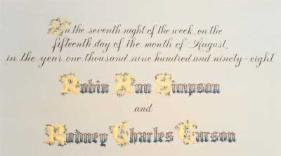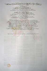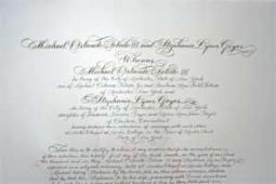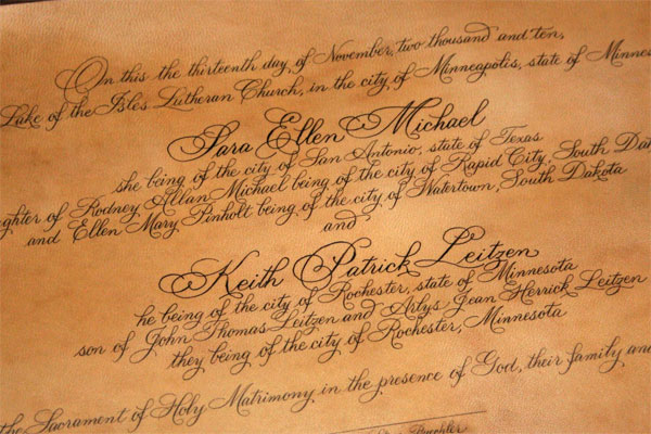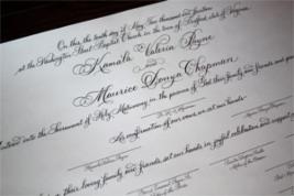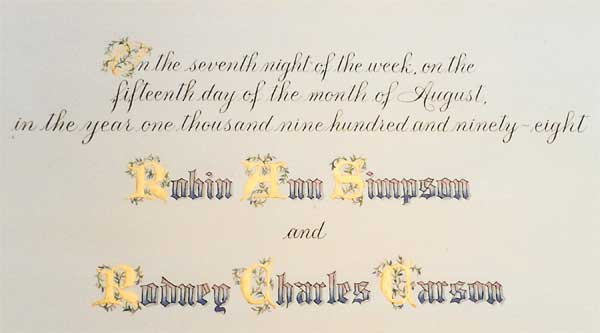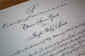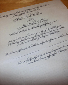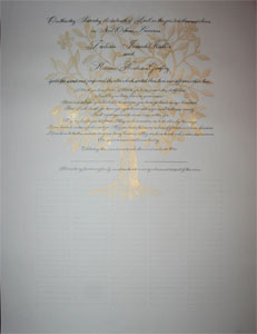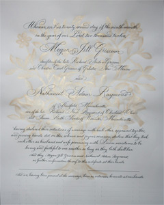 ![]() Marriage certificate on cream calf skin vellum in Bickham Script & Rook Script (click to enlarge) | Wedding Certificate on natural calf skin vellum in Rook Script (click to enlarge) |