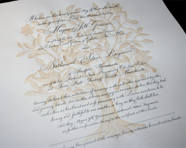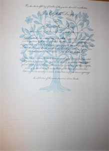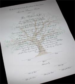 | Marriage Certificate in Bickham Script and Rook Script on cream goat skin parchment (click to enlarge) | Hand Painted Oak Tree of Life Wedding Certificate in Rook Script (click to enlarge) |